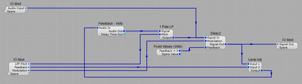 3) Feedback: We need to ensure that the Feedback plug has its parameter set to 0. Because we are using an external feedback loop we don’t wany any feedback whatsoever in the delay module.