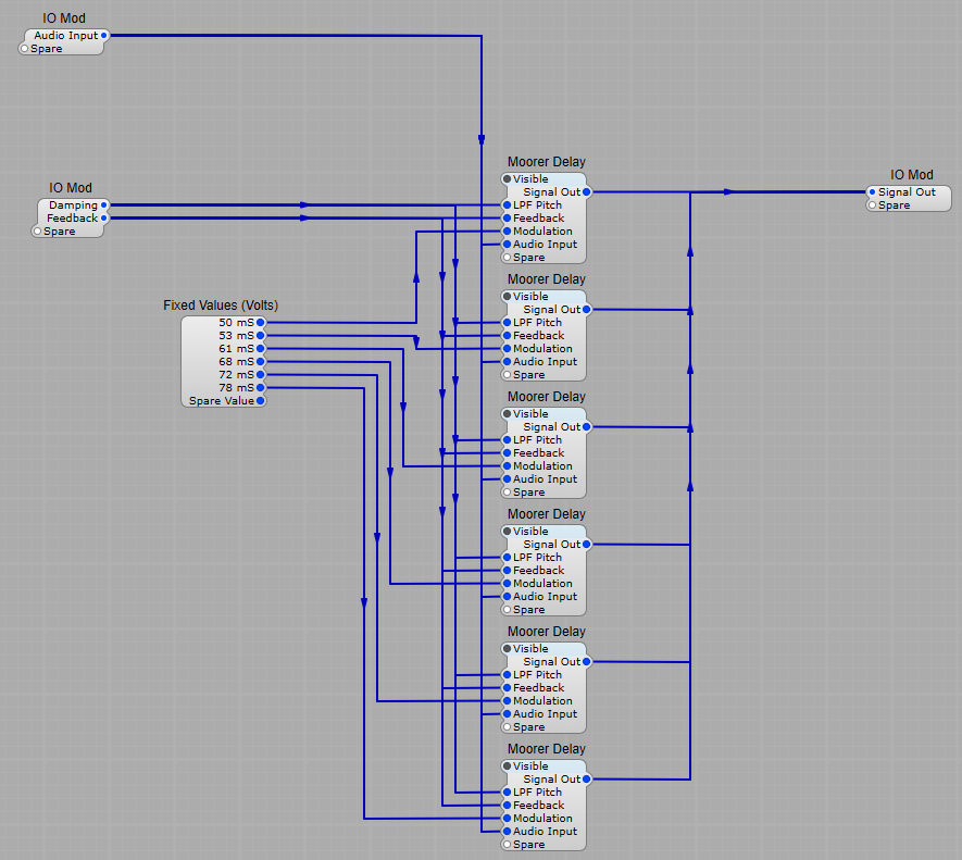 Having completed our delay with damped feedback we now come to the structure of our Reverb 6 container which has the structure shown below. This is where we have our six delays connected in parallel, with their structure of delay times.