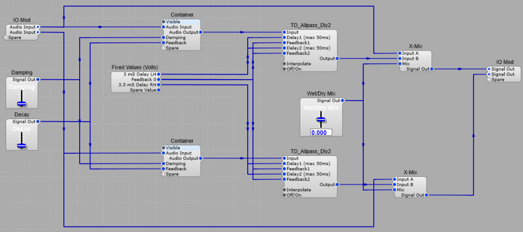 The final structure for our reverb, has two All Pass filters following the Reverb 6 modules just to “smear” the reverberated sound a little, the values used in the Fixed Value for the left and right channel All Pass filters are shown below.