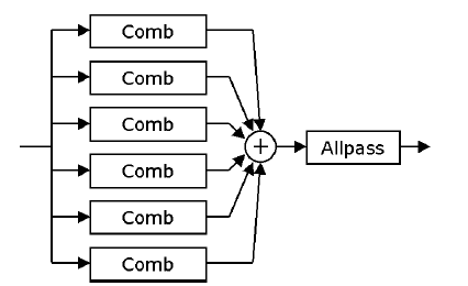 He also generated early reflections using tapped delay lines. Moorer’s reverb model employs six comb filters in parallel, the outputs of which are summed and fed into just one all-pass filter. The image below outlines its schematic.