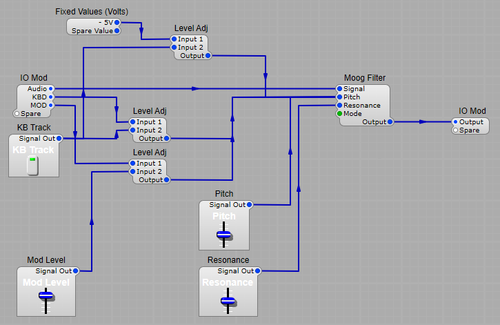 For this project I have used the filter we are probably most familiar with, the Moog Low Pass ladder filter. The structure is fairly simple. We have two Level Adj modules for the following functions.