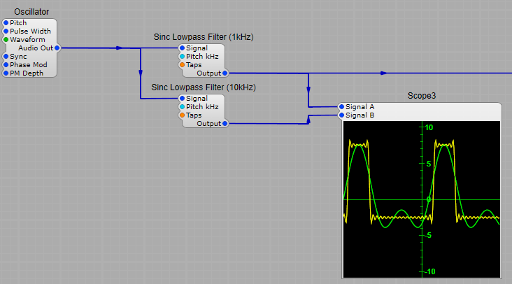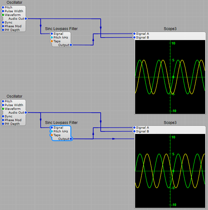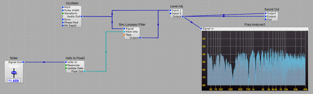 If we use an oscillator as a white noise source and mix the filtered and unfiltered signals, there is a pronounced notch (or band reject) effect going on. If we vary the filter frequency it doesn’t change the notch frequency much, but try changing the number of taps, and the notch frequency changes. Why is this? Wee by increasing the number of “taps” we are increasing the number of calculations and making the CPU do more work, so the latency increases- and with that the notch frequency changes. We can see the delay effect more clearly with a sine wave in the scope in the first example we have the default 171 taps (green i s the direct signal, yellow is filtered).