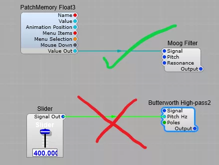 You must use a special data conversion module to communicate between the two types of data, and never use this to process DSP data, the conversion should only be used to send signals from a GUI control to a DSP module to change it’s operating parameters. Never try and use GUI to DSP for modulation or other rapid changes.