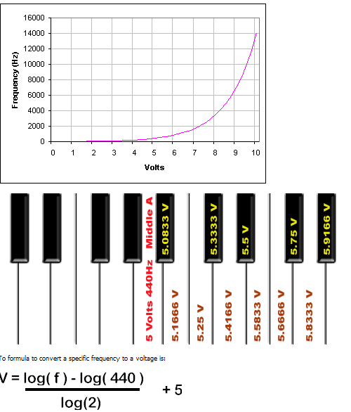 A control voltage of 5 Volts sets the oscillator frequency to 440 Hertz or Middle A, the note in the center of a piano keyboard. Increasing the input by 1 Volt will cause the pitch to rise one octave (the frequency doubles to 880 Hz ).
