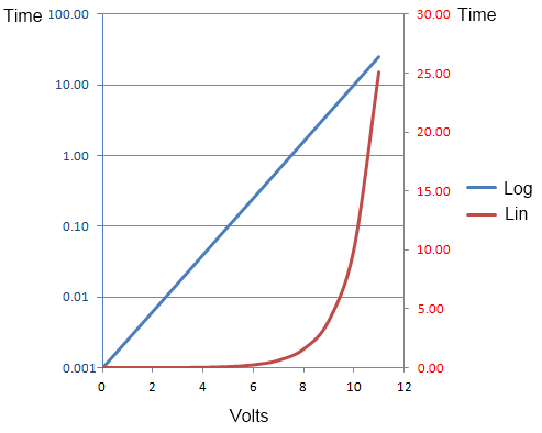 Time = 10^(Volts0.4-3) Volts = (log10(time)+3)2.5