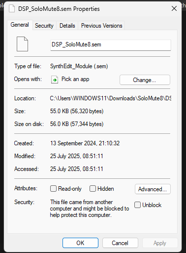 This can be a bit baffling and frustrating. The SEM’s are there in the correct place, but even with repeated scans SE doesn’t list them. This is a typical Windows 11 issue. What has happened is Windows Defender is unsure of what the SEM is, and it’s unsigned. When this happens find the SEM in File Explorer and right click on it, you’ll see this pop-up window