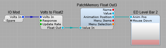 The RND Pulse out is fed into the ED Random Volts module. Each time this is triggered a new voltage is randomly generated. The Minimum and Maximum range of the output voltage is set bu the Min and Max knobs. The output voltage is fed to the ED Glider module. This module allows the rise and fall times to be set. The Glider mode should be set to constant time.