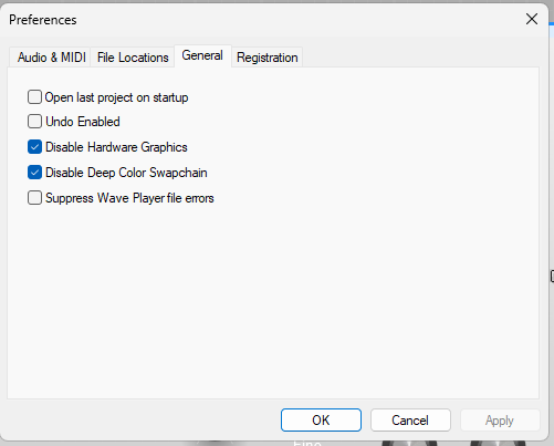 Disable Hardware Graphics, and Disable Deep Colour Swapchain. Some GPU cards are low on memory, and disabling these options may well cure (or at least improve) any graphics issues you’re having.