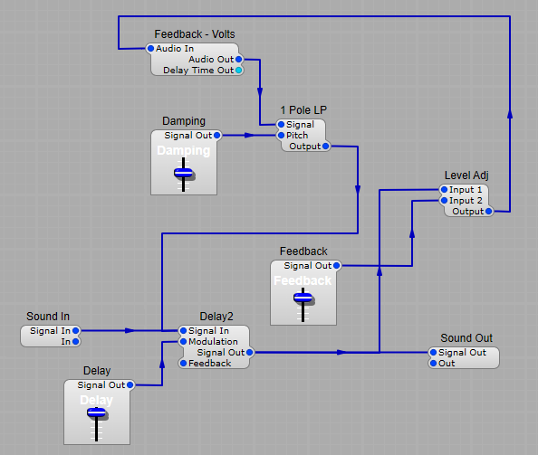 This will work well, especially if you want to introduce filters or pitch shifting into the feedback loop. The delay will still be present, but have virtually no effect (if any at all) on the resulting audio output. The structure below would give us an Echo effect with variable HF damping in the feedback loop. Just remember to set the Feedback on the delay module to 0 to avoid any strange things happening!