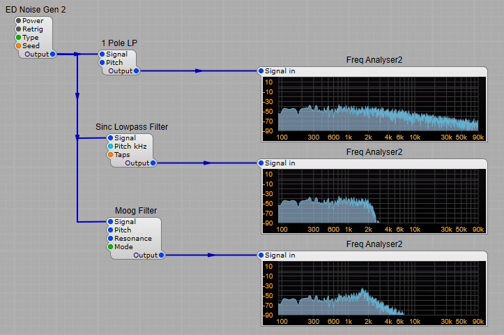 Yes there is a handy module available the Freq Analyser2, connect up a white noise source (the best signal for doing this since it contains the whole of the audio frequency spectrum). All these filters have the same cutoff frequency so you can see the difference in how they attenuate the frequencies outside the passband, and in the Moog filter the resonant peak it creates.