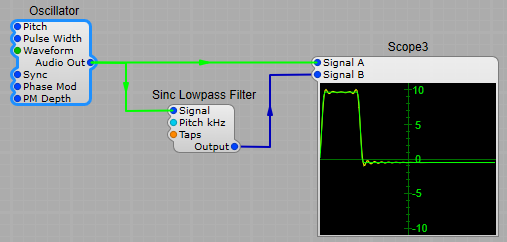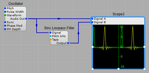 The SINC Lowpass is a linear-phase FIR Filter. “Taps” specifies the number of coefficients, more taps gives us a steeper cutoff response, but introduces progressively more latency.