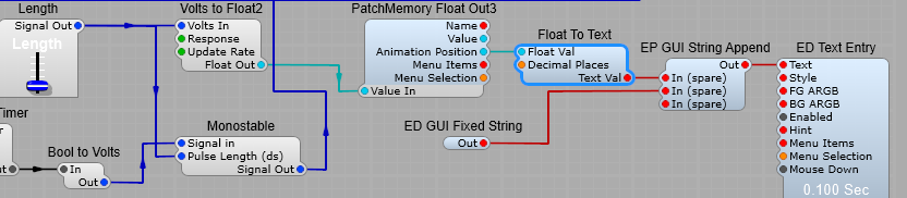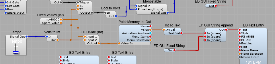 To convert the control voltage to a BPM readout the following structure is used. The control voltage from the slider is converted to an Integer value for the timer module, and also fed into an ED Divide (Int) module, where we divide the value by 60000 to obtain the BPM (ms/60000 = BPM). It’s then converted to text, and has the BPM text appended to it.