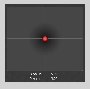 The Joystick control iteslf uses the DAM V XYo Circle module. This resturns the position of the circle, which can be extensively customized. Here I have pre-set it with a red theme. In the interests of simplicity I’m just connecting the following plugs to the IO Module;
