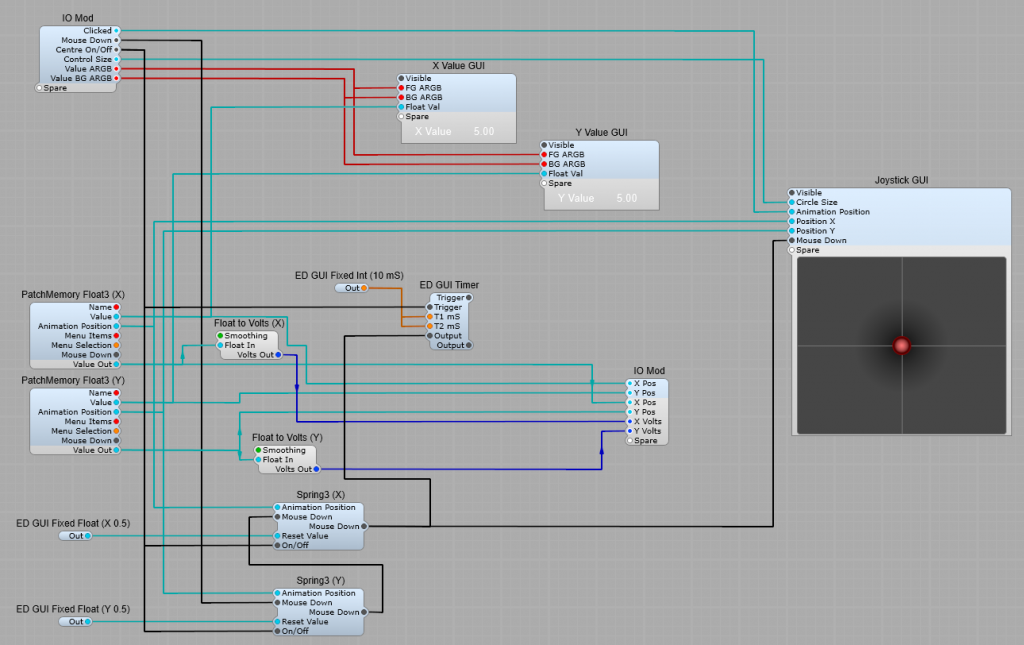 This is done with a pair of Spring 3 modules to send a value of 0.5 to the Position X and Position Y plugs. The ED GUI Timer is used to send a short (10 mS) pulse to the Spring 3 modules when the Centre On/Off plug is set to true. (I found that the Joystick wasn’t reliably setting to the centre when switched on otherwise).