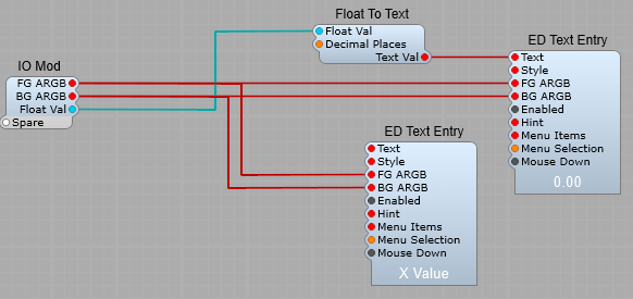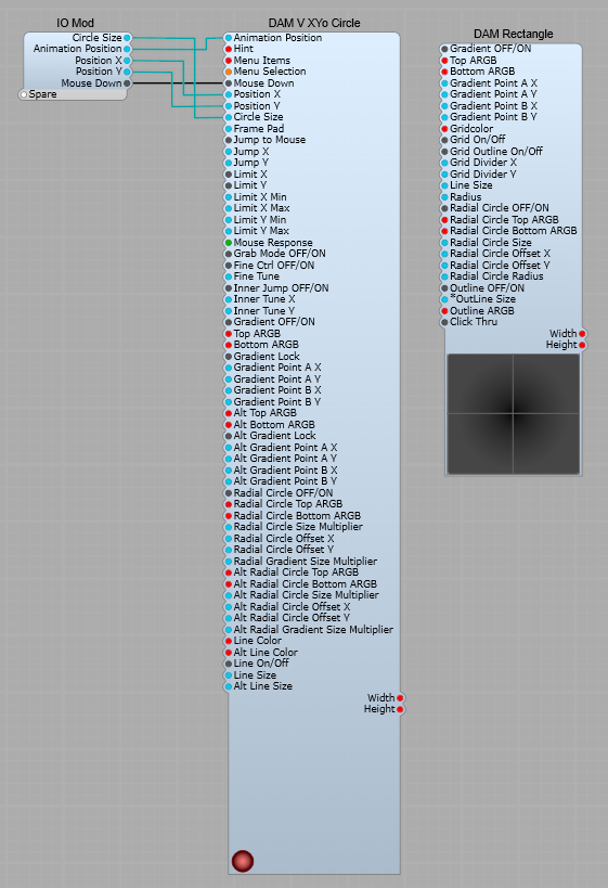 The Joystick control iteslf uses the DAM V XYo Circle module. This resturns the position of the circle, which can be extensively customized. Here I have pre-set it with a red theme. In the interests of simplicity I’m just connecting the following plugs to the IO Module;