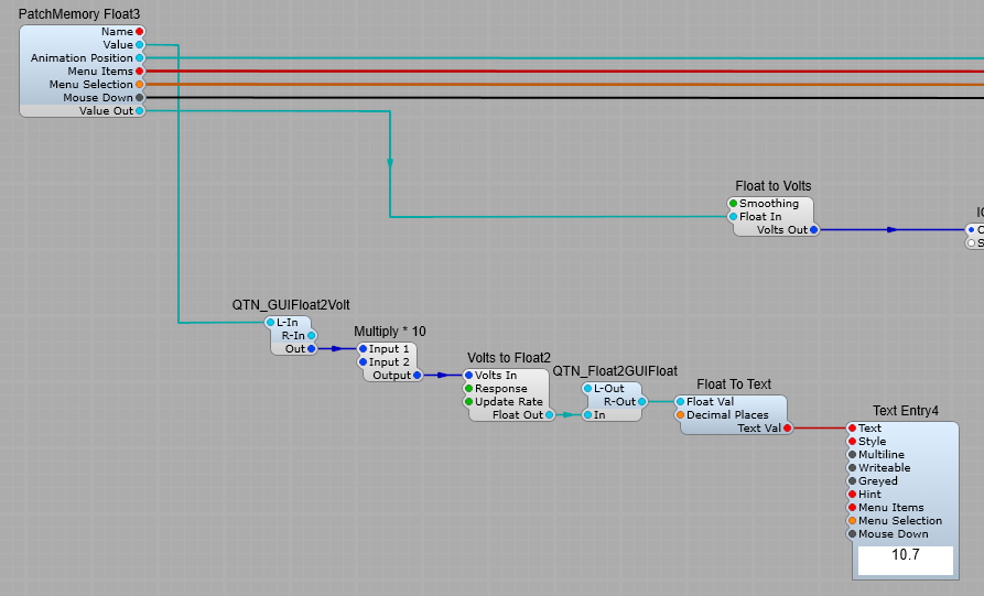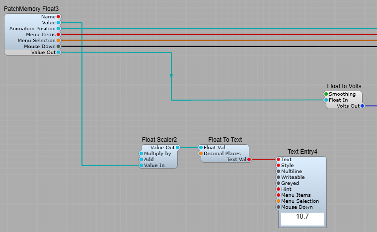 For example: Suppose you want to increase a knob’s display to a range between 0 and 100 (without actually altering the output value, your might think it’s an idea to use the standard DSP Multiplier module. Being an Audio module, this requires an extra conversion via a patch-mem or similar module. It’s far better to use a ‘pure’ GUI solution like the Float-Scaler module. This will keep your circuits far simpler and your CPU usage much lower.