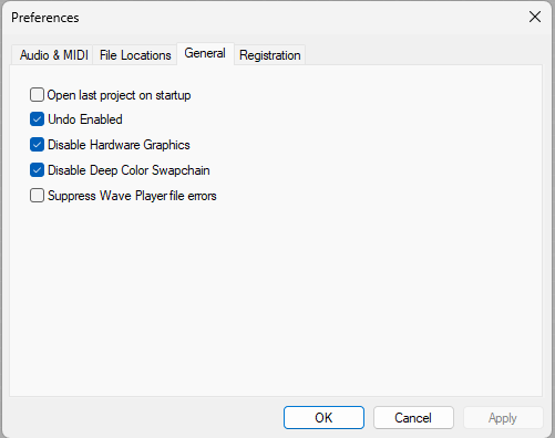 Open the Edit->Preferences option and select the General tab. Make sure that the options Disable Hardware Graphics, and Disable Deep Colour Swapchain are selected. This stops SynthEdit from using dedicated GPU memory, and reduces the memory usage by the graphics. This can solve the problem in quite a few cases where low-end GPU cards are in use. There are known issues with some Intel GPU’s and their drivers causing problems with SynthEdit.