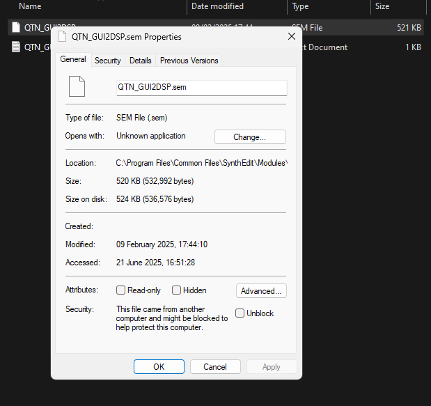 This is not a bug, this is due to the way windows treats files containing executable code that have been downloaded from the Internet. In some cases windows deems them a security risk, and blocks them from being scanned by SynthEdit. Right click on the module in question and you’ll see a properties option, click on this and this window will pop up: