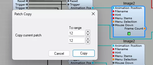 Each Trigger input to the Int to Bools module send the appropriate Integer number for the selected command to open its Dialogue Box. Once the operation has been completed the Int to Bools receives the 0 or reset signal from the Patch info module and resets the buttons to their Off state.